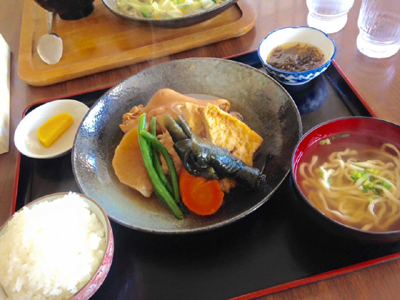 たまに食べたくなっちゃうのだ。 読谷にある読谷山そば(ゆんたんざそば)。 →読谷山そばと書いてユンタンザソバと読む 何を食べても美味しいお店ですが、 そんなところだからこそ、この煮付けに思いに胸膨らませちゃうのだ。 煮付けというのは、簡単に言えば、 ちょっと味が濃いめのおでんって感じ。 しっかり、肉も入ってて、ボリュームも満点なのだ。 →クーミー食堂の煮付け定食 ちなみにこちらの煮付け。 味付けは割とあっさり。 メインとしてのテビチが超がつくほどイケますな。 きっと、テビチ嫌いも感動して食べれちゃうくらいかと。 あとは、しっかり味の浸みた鶏肉もいい感じ。 いや~。これはちょっと癖になっちゃいそうですな。 |