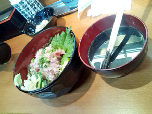 一応、すし丼・まぐろや本舗という名前。 市場の中のちょうど真ん中くらいからちょっと奥にあります。 あれ?こんなお店あったけ~。 後でネットで調べてみると、一応情報がありました。 →泊いゆまちの中にある「丼すし・まぐろや本舗」が安くて新鮮で美味しい!! 昨年11月15日にオープン。 ほう、どうりで知らなかったわけだ・・・。 メニューのほうは安いものでまぐろ丼500円、ねぎとろ丼500円。 これで、なんと汁物、小鉢がついてくる。 汁物は「いかすみ汁」「あら汁」「あーさ汁」からチョイス可能。 ごはんは「酢飯」「白米」からチョイス可能。 ん~、なかなかやりますな。 ちなみに小鉢は、マグロフレークみたいなやつ。 ワイルドなシーチキンって感じかな。 で、ねぎとろ丼をチョイス。 汁は思い切って「いかすみ汁」。 ごはんは酢飯なり。 ねぎとろ丼は普通に美味しい。 ボリュームもまずまず。 で、何よりもツボだったのがいかすみ汁。 ものすごい真っ黒です。 割り箸が黒く染まるくらい。 これで、書初めとかできちゃいそうなレベル。 でも、臭みがまったくなく、さっぱりしてて美味しいのだ。 イカの身も結構入ってるし、ほんとこれだけでも300円くらいはそうな感じかも。 けど、これはちょっとはまりそうですな。 テイクアウトできたら、ダイビングの昼食とかにもイケそうだぜって、 ガイド仲間と話してたけどね~。 |
