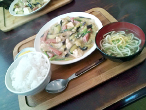 これでゆんたんざそばというらしい。 知らなかった人は要チェックですな。 最近は残波岬でのダイビングのあとに立ち寄ることが多いかも。 まあ、味も合格点だし、なによりもここの肉味噌がうまい。 ごろごろとした肉片も入ってて、食べごたえもあり。 おにぎりにいれると、もう最高ですな。 とゆーこともあって、 ストックの肉味噌ももうないことだし、 ゆんたんざそばでランチ。 日替わりメニューってのがありまして、 本日はなす味噌炒め。 「なす」ってのはなかなかおうちで食べる機会が無いので、 これにはちょっとひかれましたねぇ。 で、どーんとこんな感じ。 なす味噌炒めというよりも、なす味噌スープって感じ。 ただ、味のほうはばっちり。 ちょっと中華風な味付け。 豆腐もゴロゴロと入ってて、ボリュームも満点。 ごはんが進むってば。 これはちょっとくせになりそうかもねぇ。 ちなみに前回食べたあんかけ焼きそばに通ずるものがあるかもなぁ。 →ゆんたんざそばのあんかけそば |
