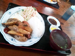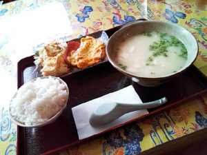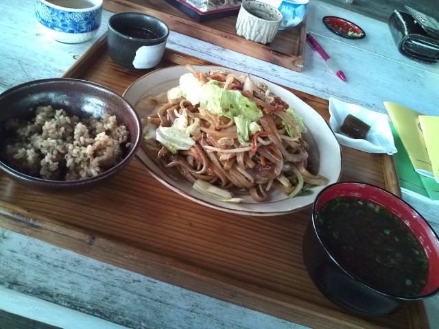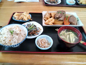 よし、今日こそはクーミー食堂だ! そんな気分ってあるよねぇ。 ちなみに前回は、無念の休業日で、 替わりに弥生に行くことになったのだが・・・。 とゆーことで、久々にクーミー食堂へ。 めぼしいメニューは、やはり沖縄そば定食。 ・沖縄そば ・ジューシーor白ごはん ・天ぷら ・ひじきの煮物 ・漬物 で、650円。 これはお得感がありますな。 しかも、白ごはん、ジューシーでもどっちでも同一料金。 ただ、ここは2回目なので、 あえて違うメニューを。 なんとなく‘煮付け‘を。 まあ、構成は上の沖縄そば定食とほとんど変わらない。 そばが煮付けになったくらい。 でも、この煮つけが上手い。 ちょっと濃い目の味付けで、ごはんがススム君! 前に来たときも思ったけど、 沖縄県内の定食屋さんにしては、とっても小奇麗。 なんか好感持てるよなぁ。 |