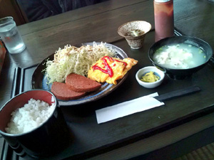 前々から気になってたんですが、 ついにいっちゃいました。 「ポークたまご」 沖縄では定食屋さんの定番メニューですが、 ここ「ちゅらさん」ではどんなかな~って。 ほんとは豚カツを食べたいところだけど、 やはり健康を考えて、たまには違うものも。 →ちゅらさんの豚カツ定食 で、でてきたのがコレ。 きちんとケチャップのボトルがついてくるところが憎いねぇって。 ポークが2枚に塩味の卵焼き。 オーソドックスなスタイルでしたね。 ポークのほうはしっかり火が通っていて、 表面はカリっと美味しい。 これは意外とはまるかもしれん・・・。 PR |